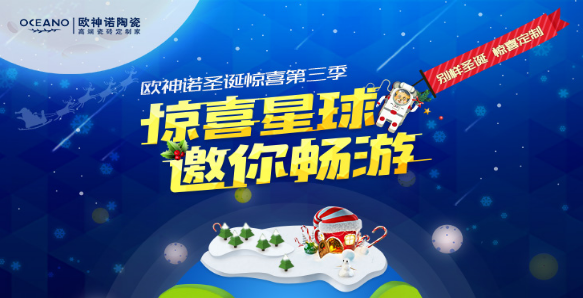 以“惊喜星球”为主题的2017欧神诺圣诞节,令人充满畅想的空间。四大主题星球的游历体验,增添了活动视觉吸引力与话题感。在活动内容上,欧神诺通过公益(爱心星球)、瓷砖DIY大赛(爱家星球)、旅行(遇见星球)、优惠(钜惠星球)四大方面,从社会活动,社交媒体,产品品牌形象,都有深化的呈现,丰富的互动形式,更可多方面吸引不同的粉丝和消费者关注。