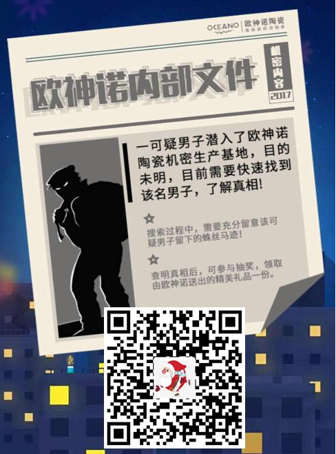 去年欧神诺以“呼叫圣诞老人”的活动形式,让欧神诺圣诞老人来到了不同的城市为粉丝传递惊喜,今年欧神诺圣诞老人将会以怎样的形式出场?不禁让人好奇。尽管圣诞还没到,但欧神诺圣诞老人早已有大动作,并推出了瓷砖工厂探秘H5,通过悬疑风的H5,不但可以为粉丝科普一番瓷砖生产知识,更可以侦查神秘圣诞事件,领取圣诞老人见面礼!扫一扫活动二维码或关注欧神诺陶瓷官方微信,就可进入游戏!