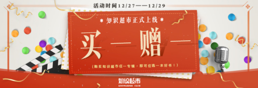 最后,知识超市还给大家带来了上线福利:2017年12月27-29日,知识专辑买一赠一活动(购买任一专辑,即可任选一本好书)。下载“樊登读书会”APP,点击底部【会】板块,即可找到【知识超市】进行选购。让我们一起用知识蜕变,用思想跨年!