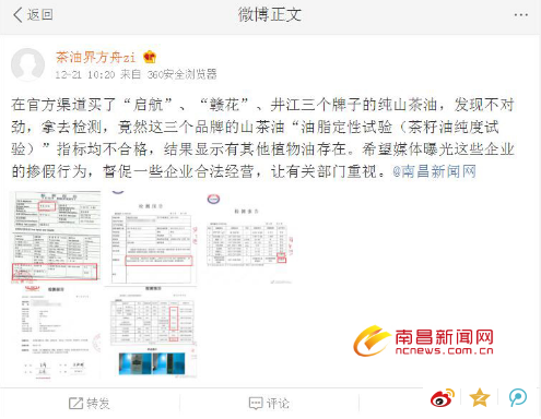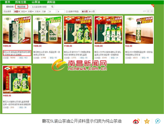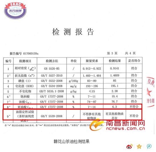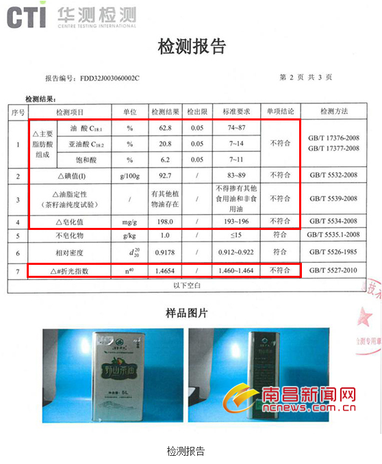 21日,网友@茶油界方舟zi通过微博向南昌新闻网爆料称,他通过某大型购物网站官方店购买的多个品牌的山茶油有问题,并向记者出示了权威检测机构出具的检测报告。@茶油界方舟zi说,根据油脂定性试验(茶籽油纯度试验)检测项目检出的情况来看,“赣江”、“山润”、“启航”、“赣花”、“井江”这五个品牌送检的相关山茶油均不符合GB11765-2003《茶油籽油》国家标准,报告显示“有其它植物油存在”。他表示,除了不纯,其中送检的赣江山茶油5升装存在“主要脂肪酸组成”、“皂化值”、“折光指数”不符合相应标准这一问题,井江山茶油5升装则比赣江山茶油5升装多出一项“碘值(I)”不符合。
