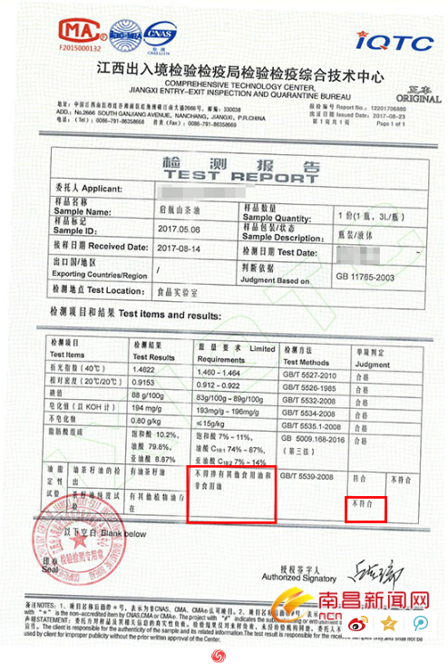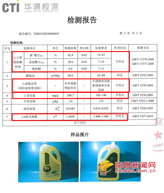 就网友@茶油界方舟zi提供的检测报告,暂时未得到“赣江”、“山润”、“赣花”、“井江”、“启航”等生产企业的确认。
