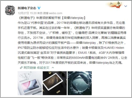 对于此次荣耀Waterplay获奖,新潮电子官方微博表示:作为足以“代表中国”的品牌,2017年的荣耀在移动通讯领域有太多作品,无论是手机还是平板。其实在过去的每一年,《新潮电子》年终颁奖盛宴亦有荣耀的存在,不张扬不空谈,“广积粮,缓称王”,它懂得把“品牌文化营销”的精髓运用得行云流水。
