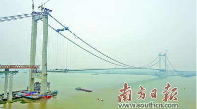 近日,“超级工程”虎门二桥项目连续传来好消息,两座超千米级的悬索桥工程建设同步取得新突破,除跨径1200米的大沙水道桥钢箱梁顺利吊装架设完毕并成功合龙外,跨径1688米的世界第一钢箱梁悬索桥坭洲水道桥完成主缆紧缆施工,双双实现了2018年建设的“开门红”。(来源:南方日报)