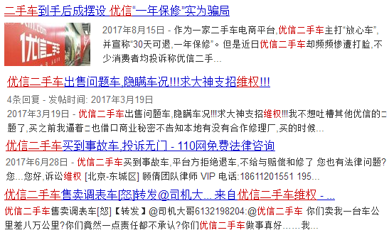 而这样的消费案例并不是个例,在微博、汽车论坛等地,到处可见消费者在优信二手车平台上购买到问题车后维权未果的新闻、帖子。