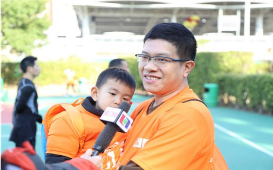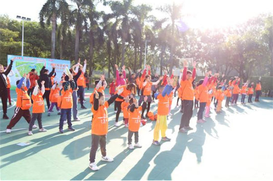 (东莞亲子家庭在比赛前跟着教练一起做热身运动)