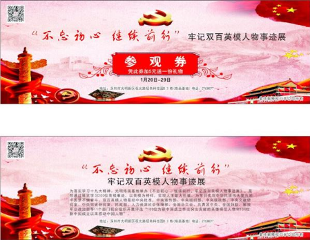 由“没有共产党就没有新中国”专题书画组委会、中国城乡复转军人创业工作委员会、中国拥军优属基金会八一军创工作委员会、中国传统文化促进会、中国毛泽东手书馆、深圳市国防教育促进会、深圳雅善正能量公益文化传播中心、深圳市烙画艺术协会、深圳成功者研究会主办;深圳弘扬烙画艺术发展有限公司、深圳市嘉实宝文化传媒有限公司、深圳悦和礼品广告有限公承办的“不忘初心,继续前行”牢记双百英模人物事迹展于1月20日至29日在光明烙画基地举行。为期10天向市民免费开放参观。