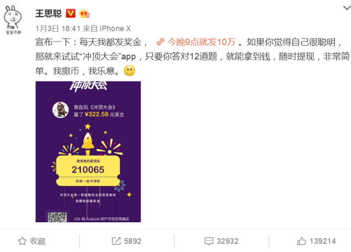 2018年伊始,以冲顶大会为首的直播答题节目迅速走红,简单的游戏规则加上真金白银的刺激在短时间内收割了数百万用户的注意力,自从国民老公王思聪出来站台后,更是将这个模式推向了新高潮。目前不少品牌方也被这种新颖的模式所吸引,跨界玩起了各式新花样。