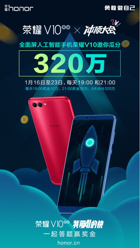 据冲顶大会官方发布的最新消息,荣耀V10将联合冲顶大会发起为期8天(1月16日-1月23日)的合作,从今天开始每晚分19:00和21:00两场,奖金合计320万元。按照之前的惯例,这16场的题目肯定与荣耀V10的各项产品点息息相关,想去答题瓜分320万奖金的可以提前去了解下这款手机。