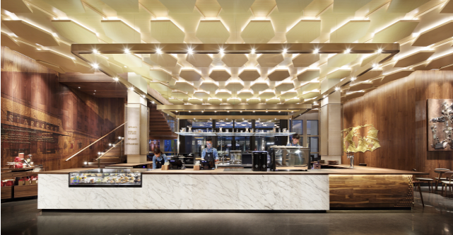 作为一家彰显星巴克经典传承与咖啡领导力的标志性旗舰店,万象天地店把这份“臻心”体现在门店内点点滴滴的设计上。透过玻璃落地窗看入内,整家门店宛如一个大型的咖啡实验室。引人瞩目的六边形天花板设计代表着咖啡的DNA排列组合,一楼的木纹肌理在层叠之间透着暖黄色的灯光,夜幕下美轮美奂;而二楼的天花板则是还原咖啡烘焙深浅不一的铜制DNA形状,无处不展现着星巴克对咖啡的高度热情与专注。