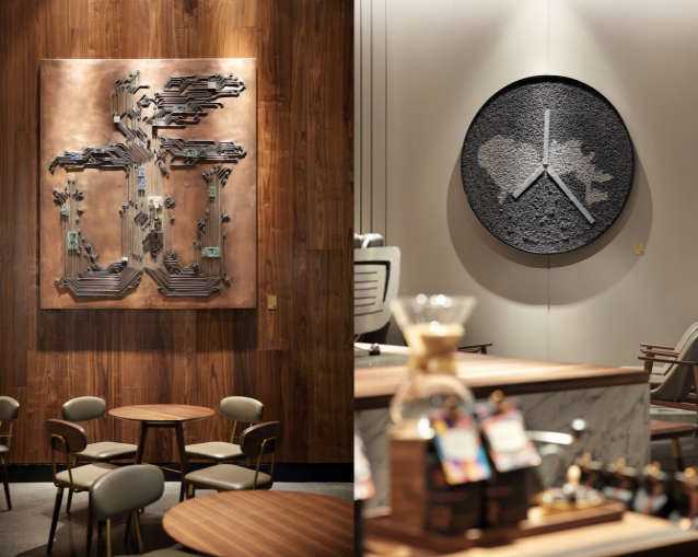 在一楼,最引人驻足的,莫过于是由电路板和铜管构成的一幅艺术作品,星巴克用其最具代表性的美人鱼标志呼应了深圳在中国电子业举足轻重的地位。而吧台旁,由金色棉线层叠交织而成的“世界地图”,更是艺术家花了三天、现场绷制而成。棉线象征着星巴克行走于世界上找寻优质咖啡豆的旅程,也是对深圳发达的成衣制造工艺的致敬。二楼一幅由生豆和不同烘焙程度的咖啡豆以及电容组成的艺术作品,乍看之下是一个指向七点的时钟,细看却发现这演绎了烘焙工坊中的咖啡豆冷却盘,而且又巧妙地糅合了一副无比熟悉的深圳地图,星巴克与深圳的故事跃然其上。另一旁的独立空间内,是一面满布年轮的手绘画作,与深圳的快节奏不谋而合,在“年轮”的转动下,在万象天地旗舰店这个充满畅想的空间里碰撞、创作,描绘咖啡的未来