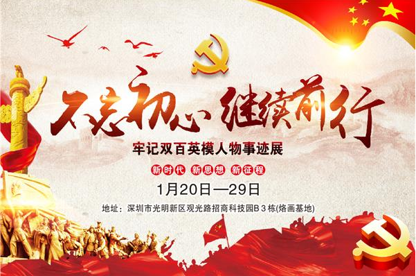 2018年1月20日下午3点,由“没有共产党就没有新中国”专题书画组委会、中国城乡复转军人创业工作委员会、中国拥军优属基金会八一军创工作委员会、中国传统文化促进会、中国毛泽东手书馆、深圳市国防教育促进会、深圳雅善正能量公益文化传播中心、深圳市烙画艺术协会以及深圳成功者研究会联合主办;深圳弘扬烙画艺术发展有限公司、深圳悦和礼品广告有限公司承办的“不忘初心,继续前行”牢记双百英模人物事迹展在光明观光路烙画基地正式亮相市民,展出共10天。出席本次展会的有原深圳市副市长卓钦锐市长、原广东省公安边防总队政治委员苏少军少将、原长春市常务副市长尹文、原深圳市政协副主席周长瑚、中国拥军优属基金会八一军创工作委员会主任史俊义、原深圳市委常委、警备区司令崔晓汉、深圳市文体旅游局文产处副处长何国伟、原光明新区综合办李百军处长、成功者研究会会长伟雄、深圳雅善正能量公益文化传播中心主任程祖旭以及本次活动组委会主任、深圳市烙画艺术协会张守福会长等共200人见证重温了200位当年的英模肖像和英雄事迹。