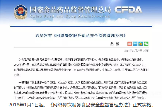 2018年1月1日起,《网络餐饮服务食品安全监督管理办法》正式实施。