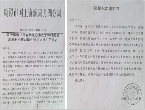 另外,为了胁迫、报复打压刘洪生,鹰潭市国土资源局月湖分局、鹰潭市月湖区城乡规划建设局、鹰潭市房产管理局联合出手,以刘洪生2003年即建成并依法取得产权证的鹰潭市五洲路五洲花园10号房屋是欺骗所得为由,取消了刘洪生该处房屋的产权证,定性为违建,并限期拆除。