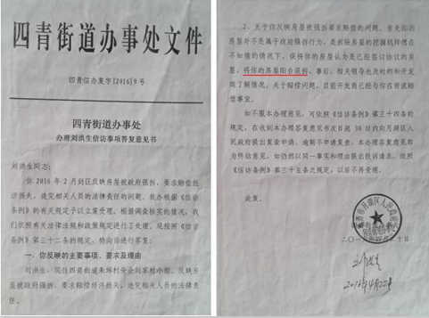 根据刘洪生的投诉反映称,当地政府为了胁迫、报复打压自己,将其2003年即建成且依法取得的产权证的鹰潭市五洲路五洲花园10号房屋取消产权证,定性为违建,并限期拆除。记者就此向月湖区国土局姜队长、城区分所何洪伟所长采访核实。