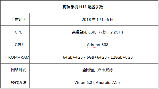 从参数表不难发现,海信手机H11在配置方面相较于前代产品有了许多新的突破:H11搭载高通630处理器,最高配备6GB RAM+128GB ROM的内存组合。屏幕方面,H11采用5.99英寸FHD+全面屏,屏幕像素密度442,显示画面细节丰富。