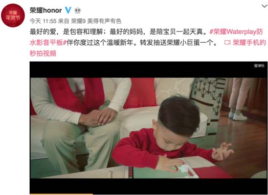 今日,荣耀手机官微重磅发布2018新春视频《最好的妈妈 就是陪宝贝一起天真》,视频一经推出,立刻引起诸多微博大V转发,评论也掀起了一阵热烈讨论。瞬间接力了前几天陈可辛导演的iPhone X过年视频的热度效应,而这部作品的主角,则是2017年度斩获佳绩惊艳行业的安卓平板领头羊——荣耀Waterplay!究竟是怎样的内容,吸引了众人的目光,使得这支不过45秒的视频,从各大品牌扎堆的新春视频中脱颖而出?