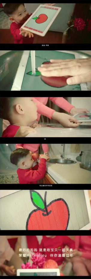 这个看上去极其简单的故事,荣耀官方想传达的不仅是荣耀Waterplay这款防水影音平板本身的功能亮点,结尾点题的那句话“最好的妈妈,就是陪宝贝一起天真”,可谓是更深层次地传达出一种看似与传统的中国式教育背道而驰的理念——看到孩子做错了,不是简单粗暴地纠正斥责,而是原谅宽容孩子这样“不经世事”地表现,去呵护甚至是帮助其展开发挥想象力。妈妈能在短短的几秒钟内,想到“洗真平板换真苹果”的浪漫妙招,可谓是别有一番心境。