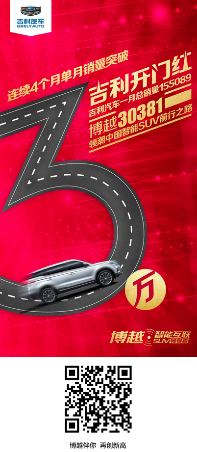 2018年的1月已经过去,与各地气温纷纷跌破冰点不同的是,汽车市场迎来了一片红红火火“开门红”,目前率先公布了业绩的十数家汽车厂商大多实现了正增长。近日,吉利汽车官方公布了2018年1月份的销量数据,吉利汽车1月共销售155,089辆,同比增长51%,以创历史新高的成绩迎来2018年市场的开门红,旗下共8款车型月销量过万,为达成全年158万辆的销量目标迈出了坚实的一步。其中“销量担当”博越销量高达30,381辆,同比增长51%,并连续第4个月销量突破3万辆。