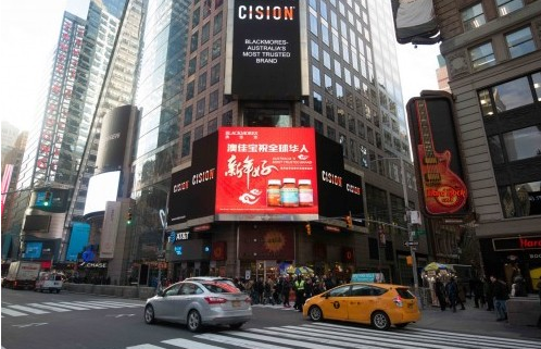图一:澳大利亚天然营养补充剂巨头BLACKMORES澳佳宝霸屏纽约时代广场恭祝全球华人新春快乐十犬十美