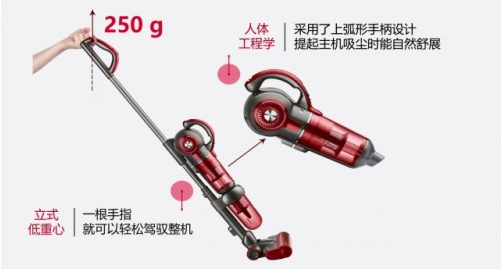 同时,莱克还对手持主机进行了平衡优化,上弧形手柄持握时手腕与主机达到力学平衡,手腕角度自然舒展,握姿更顺手,持握更省力,一根手指即可拎起,使用超轻巧!