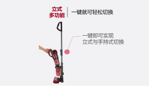 立式地面吸尘模式转手持模式只需要按一键就可切换,无需弯腰把机器放到地上拆装。