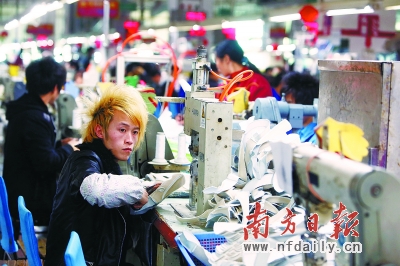 位于东莞厚街赤岭工业区的绿杨鞋厂,“90后”的身影随处可见。他们各色的头发已经不再让周围的同事们感到新鲜。