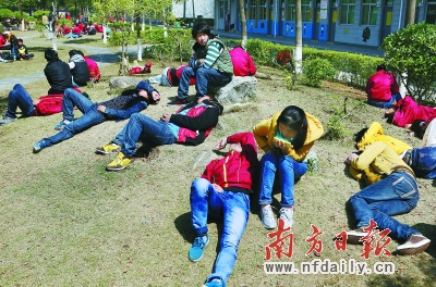 每天午饭后,外宿的员工只能躺在草地上休息一会儿。