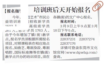 另据介绍,今年的“走进艺术”市民公益文艺培训班走进基层,在南城、莞城、东城、万江、虎门、麻涌和茶山等镇(街)的文广中心设立了教学点,让更多市民就近“走进艺术”。
