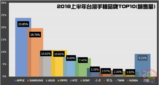 而在2017年底,ePrice统计的数据显示,OPPO、华为、小米的市场占比分别为8.6%、2.7%和2.4%。其中华为上升的速度最快,OPPO更是在2018年6月份进入台湾市场前三。