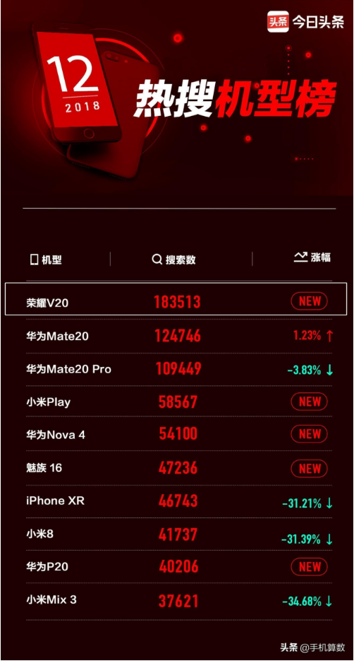 1月20日,今日头条官方公布了去年12月的“头条手机榜”,去年12月26日发布的荣耀V20,仅用5天时间便轻松拿下今日头条12月热搜机型第一名,主动搜索数超第二名47%,成为当月最热门机型。