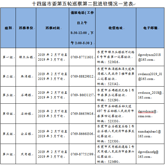 十四届市委第五轮巡察第二批被巡察对象包括樟木头、麻涌、石碣、石排、企石、凤岗6镇党组织。巡察期间,各巡察组主要受理反映被巡察单位党员干部的来信来电来访,重点是关于违反政治纪律、组织纪律、廉洁纪律、群众纪律、工作纪律、生活纪律等方面的举报和反映。其他不属于巡察受理范围的信访问题,将按规定由被巡察单位和有关部门处理。各巡察组欢迎广大干部群众反映情况和问题线索。