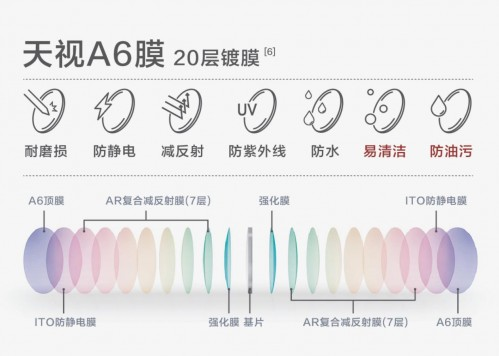 除了基片材料,在镜片膜层上明月镜片也有其独特优势。天视A6膜是2018年投入市场的明月镜片高端膜层系统,具有良好的光学性能,并且能够更好的防水、防尘、防静电、抗油污、耐磨损。在网易、极果等媒体评测中均表现优异,将502胶水滴在天视A6膜的镜片上,502胶水都不会凝结粘连甚至留下痕迹,其表面光滑度及防污能力可见一斑。