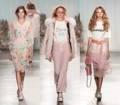秀场中设计师选用了大量的粉色来表现女性身上普遍拥有的柔软与俏皮活泼,它是各国少女文化中无处不在的颜色,如洛丽塔脸上挂着的红晕炫耀中留下令人深刻的一抹俏丽。设计师采用了印花,花呢、粉色皮草、手工钉珠等多种梦幻元素,还原了专属于少女的粉色梦境。
