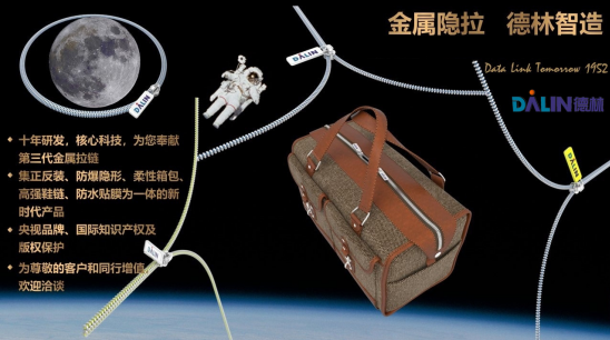 拉链外面是一个公开的世界,而拉链的里面则是个隐藏的世界。一花一世界,一叶一菩提, 拉链虽小,却是妙不可言,就让我们一起继续开展“拉链之旅”吧!德林(DΛLIN)服饰科技有限公司秉承“匠工智造”之心,永远与您同在。