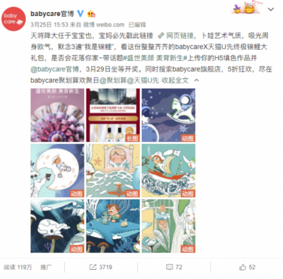 不止有互动有趣的H5,万份U先礼盒大派送,babycare联合天猫U先还发起寻找babycare锦鲤的活动,并一并打造了万元终极锦鲤大礼包,上千万的曝光也为品牌赚足热度。