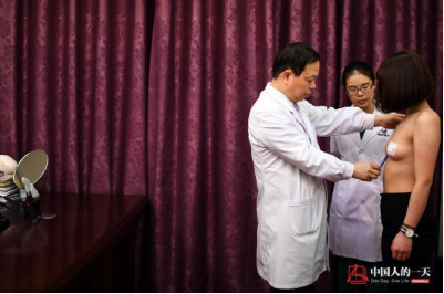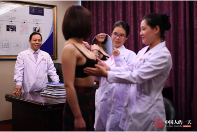 来到王新灿医生办公室内,李文自信满满的向王院长展示她的C罩杯内衣,王医生对李文的术后恢复、胸部形态及伤口愈合等进行全面检查。