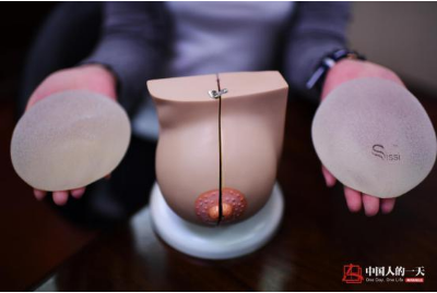 王新灿医生将假体放入李文右胸内。