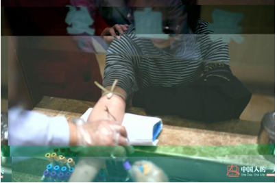 丰胸手术前,工作人员陪同李文来到抽血处化验采样,检测她的身体健康状态。