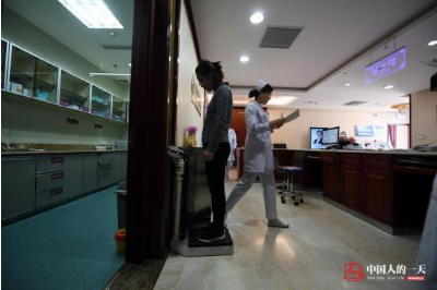 在护理站,李文站在秤上称体重,她开玩笑说:“手术完后,我的体重肯定比现在重啦!”
