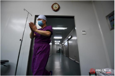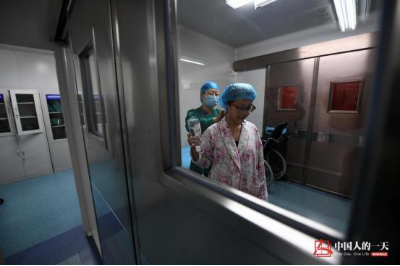 护理人员在帮李文更换手术服,并不时给予她精神安慰,鼓励她勇敢。