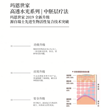 “玛恩世家”高透水光,则是在中胚层疗法技术基础上,添加复合生物活性配方,针对皮肤缺水、干纹细纹、肤色暗沉、斑点、油脂过剩、出现老化症状等系列问题,以严苛标准配方,研制出水润N°1号、瓷肌N°2号、童颜N°3号三种类型的水光,分别具有深层补水、瓷肌嫩白、抗衰除皱的功效,并根据不同人群的不同肌肤问题,搭配使用其他的产品, 定制最适合个人的美肤方案。