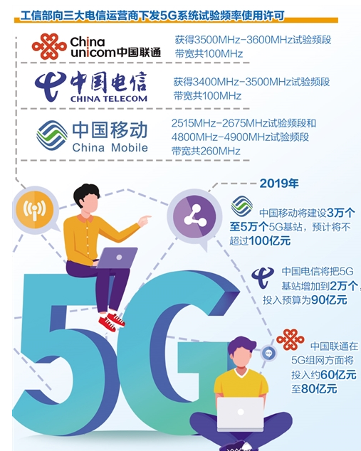 据了解,2019年,中国移动将建设3万个至5万个5G基站,总投入规模不会高于2018年,有专家预计将不超过100亿元;中国电信表示,2019年将把5G基站增加到2万个,在5G建设方面的投入预算为90亿元;中国联通则表示,在5G组网方面将投入约60亿元至80亿元。