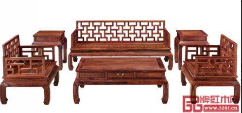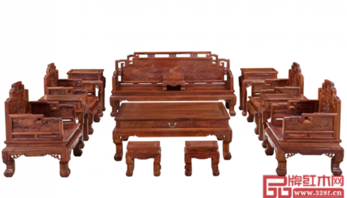 红酸枝《鸿运沙发》则对雕刻手法有更高的要求,圆雕、浅雕等雕刻手法的综合运用,将牡丹所象征的华贵典雅寓意表现得颇具韵味。大红酸枝(学名:交趾黄檀)《皇宫椅》则以卷草纹镂空雕点缀椅背与扶手,使整体造型庄重大气。