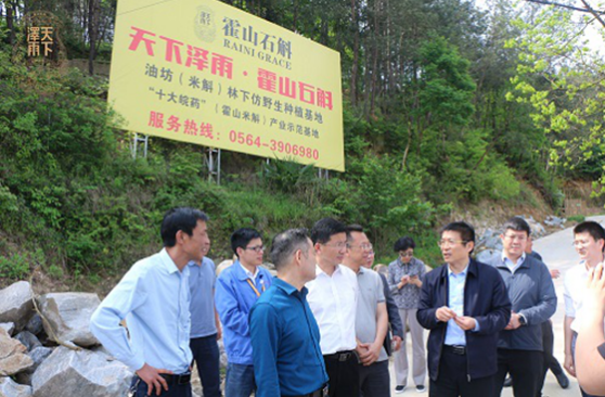 4月25日,国家中医药管理局局长于文明,国家中医药管理局科技司司长李昱,国家中医药管理局医政司司长蒋健等一行在安徽省卫健委党组书记单向前、安徽省卫健委副主任董明培的陪同下,莅临霍山县天下泽雨公司调研,并先后实地查看了公司药厂和霍山石斛石上林下种植基地,了解了霍山石斛的生产、加工和种植情况。天下泽雨公司卢董事长和杨涛总经理以及基地员工代表陪同参观。