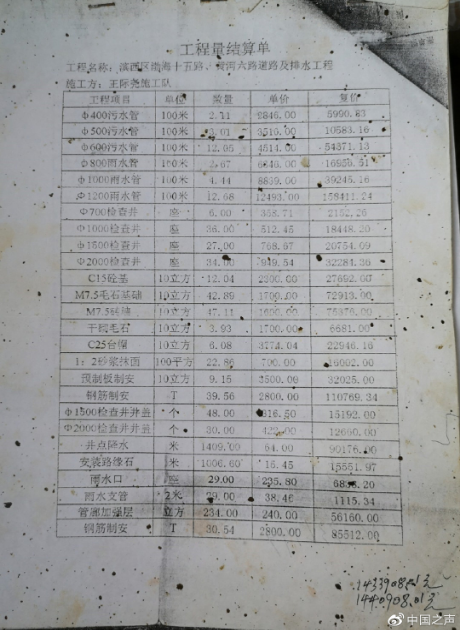 王成建向中国之声记者提供的十多份只有签字没有公章的结算单显示,工程项目名称有“渤海十五路新开河桥工程”“渤海十五路、黄河六路道路及排水工程”“滨西区新立河桥工程”“黄河五路人行道工程”等等,工程结算时间最早的是2002年11月。