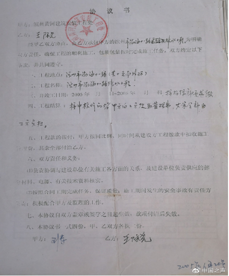 王成建说,父亲王际尧带着同村的乡亲组成的工程队四处揽活儿。从1998年开始,和滨州黄河河务局下属的滨州市黄河建筑安装工程处建立了稳定的合作关系,“排水工程、公路桥,还有路面,污水管道等等这些,一直干到07年。拖拖拉拉的,工程款一直也没付全,到现在还欠150多万。”