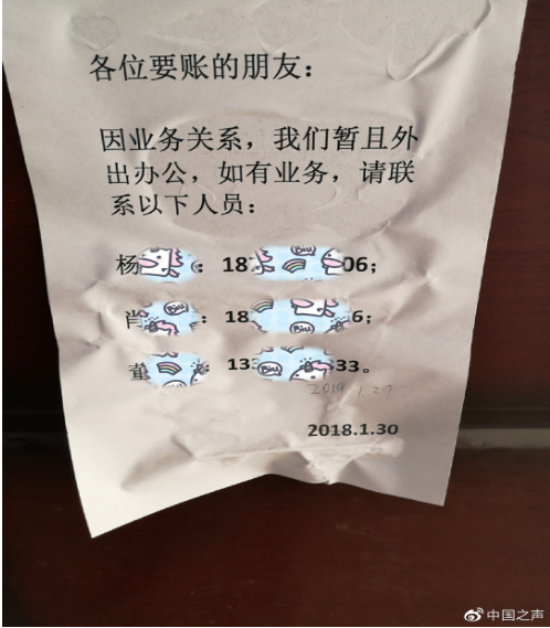 本月初,记者来到位于滨州一个居民小区内的黄河建筑安装工程处,三层的大楼里空空荡荡。在二层的一个办公室门口,张贴着一则通知:各位要账的朋友,因业务关系,我们暂且外出办公。