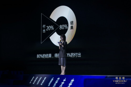 接着,VMESHOU(唯蜜瘦)品牌创始人兼公司CEO周芬女士做了经验分享。她说,这个时代最厉害的就是「天时」,天时就是趋势,只有趋势才能带来最有爆发力、杀伤力以及指数级的增长。一个人若想成功,首先要做到的是“顺势而为”。而唯蜜瘦这个平台,就是用好的产品结合了新零售+大健康的趋势。一个人如果要做成一件事情,其实本质上不在于你多强,而是你要顺势而为,把握机会,于万仞之上推千钧之石。精彩的分享,引起了台下众多与会者的广泛共鸣。