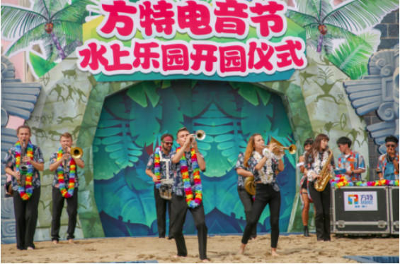步入开园仪式的主会场,最先映入人们眼帘的,是一片风格独特的海滨风情布景,仿佛将东南亚海滨沙滩打包搬到了方特城堡下方。绵软金黄的海滩细沙,翠绿浓密的棕榈树丛,好一派东南亚海滨风情。色彩缤纷的特调饮料,性感热辣的比基尼走秀,一场浪漫沙滩派对正在火热进行,动感十足的音乐将在场游客的激情点燃,欢乐氛围席卷整个主会场。精心布置的主会场完美契合了方特水上乐园的东南亚特色,同时又传达出方特电音节热情奔放欢乐至上的精神内涵,将两者风格完美地融合在一起,给在场的游客呈上一场欢乐盛宴。