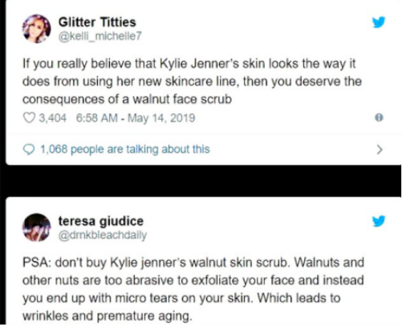 而且,这样的一个产品,居然被Kylie选来作主打,让Kris Jenner宣传,宣传台词是绝对安全!但很多美妆博主就说到,这款磨砂,很有可能损害肌肤屏障,会导致不可逆的衰老。
